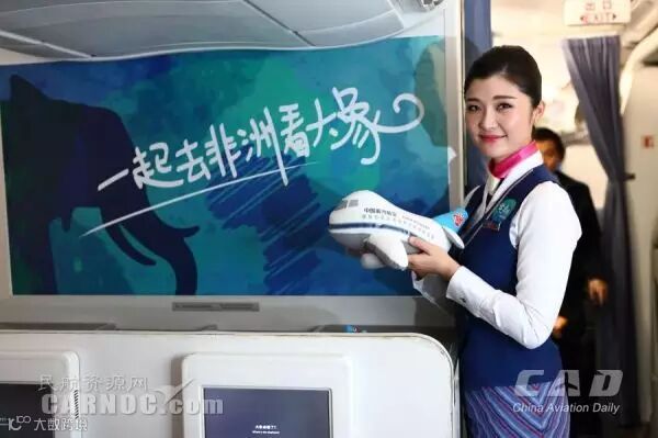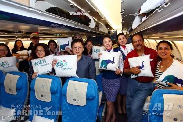 执飞该次航班的飞机与往常显得很不一样:飞机客舱内部和行李架上都装饰着以蓝绿色调为底色的装饰大象图案,有的是一只健硕的公象,有的是母象与小象温馨共处,有的是一只活泼可爱的小象,每个座位上都放置了一个“一起到非洲看大象”的靠枕,飞机的电视荧幕上播放着“爱大象”视频,空姐们统一佩戴着有大象图案的胸章,还有大象眼罩、大象明信片、连航机上的杂志都是大象的封面……大家仿佛置身于美丽的“非洲大草原”。