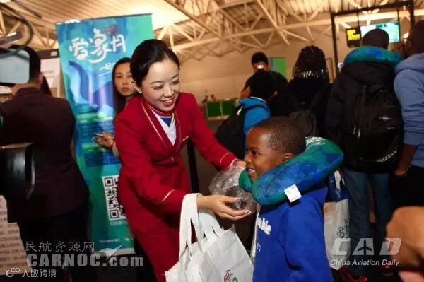 让旅客更加惊喜的是,每个座位上还有一个”一起到非洲看大象“的靠枕,座位的屏幕上也在播放着”爱大象“视频,空姐们也佩戴着有大象图案的胸章,还有大象眼罩、大象明信片、连航机上的杂志都是大象的封面……大家仿佛置身于美丽的”非洲大草原“,成为”大象家庭“的一员,虽然飞机还未起飞,大家的心已飞抵了远隔重洋的非洲大陆。