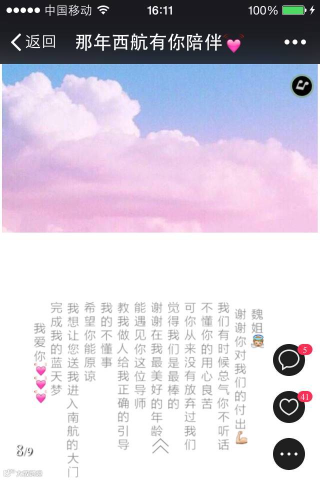 才到班级的时候觉得你非常严厉,无情,每天都要上英语课,天天都要背英语,单词,句子,广播词,觉得好烦,随着时间的推移,才发现你是真的对我们很好,你天天守着我们,给我们上课,你也很累,我们还给你找麻烦,干扰你的工作,其实你也很累,可是你自己一直咬牙坚持,在背后努力,真的把我们当做你自己的儿女一样对待,把我们一个个送上了工作岗位,让我们养成良好的习惯,学习更多的文化知识,你不仅是我们是魏姐,你更是所有南航天使班天使们的母后。