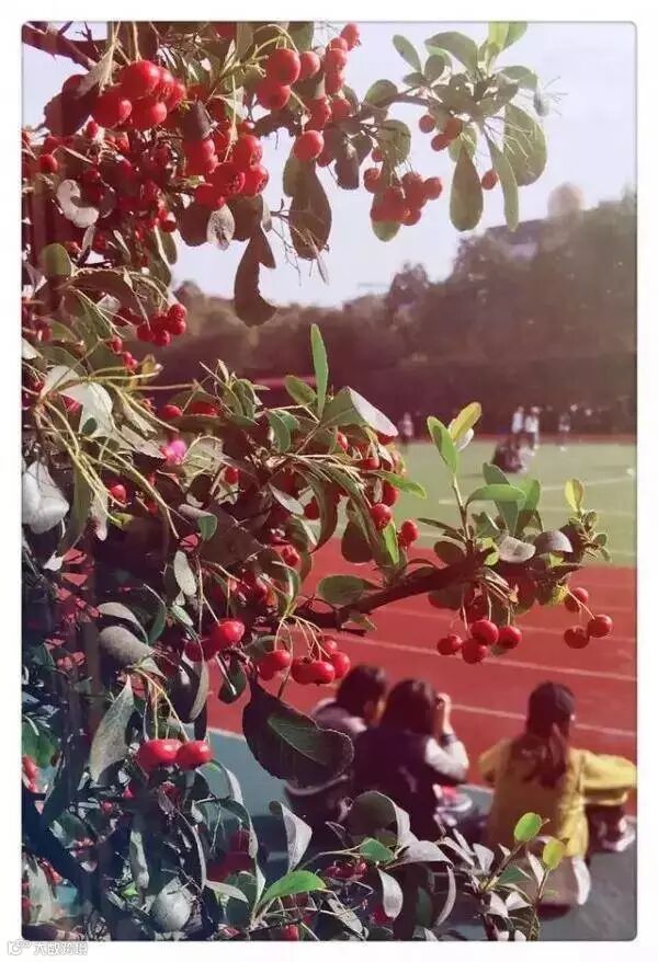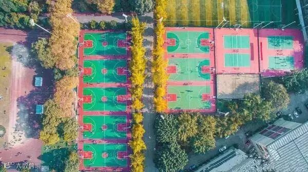 球场上红色底、绿色底的橡胶和金黄的银杏叶相得益彰,颜色好看得不要不要的