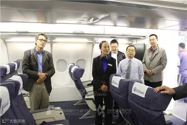 长老会学院国际项目部主任Mr Viet Ha一行人在学院领导陪同下参观学院一流实训室(图为B737-800服务训练舱)
