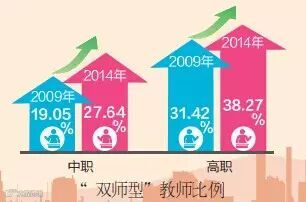 师资是提高教育质量的关键。据介绍,2014年,中等职业教育专任教师数为86.30万人,生师比为21.3∶1,而2010年的这一比例是26.6∶1。高等职业教育生师比为17.6∶1,与本科高等学校生师比基本一致。多地通过培养培训并举、实施教师素质提高计划、教师企业实践、对口培训和境外培训,促进“双师型”教师队伍建设,“双师型”教师比例有较大提升。