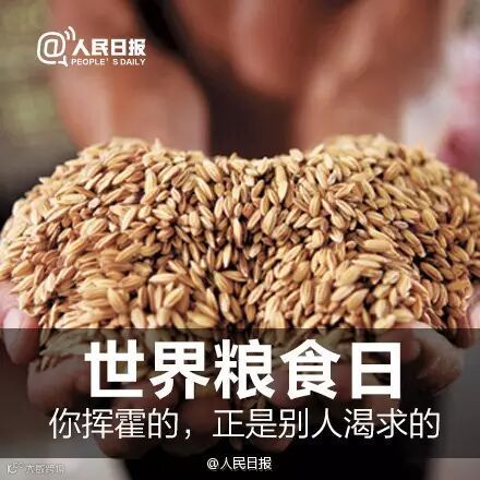 【你挥霍的,正是别人渴求的】全世界近8亿人食物不足,9人中就有1人挨饿;全球每年浪费的粮食价值达4000亿美元!在中国,每年被倒掉的食物相当于2亿多人一年的口粮。世界粮食日,提醒饥饿记,不为重温苦难,而为在忧患中远离粮食危机。珍惜粮食,拒绝浪费!(@人民日报)