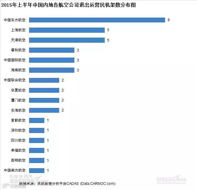 图表显示,上半年时间,东航有9架飞机退出运营,上海航空和天津航空各有5架飞机退出运营。