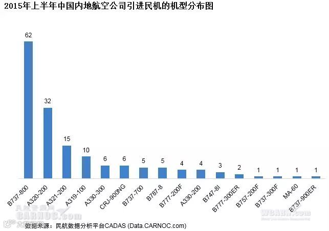 纵观CADAS数据,2015年上半年,我国内地各航空公司引进A320系列飞机57架,波音737系列飞机69架,空客A330、波音747、777、787等宽体机飞机24架,引进支线飞机7架。