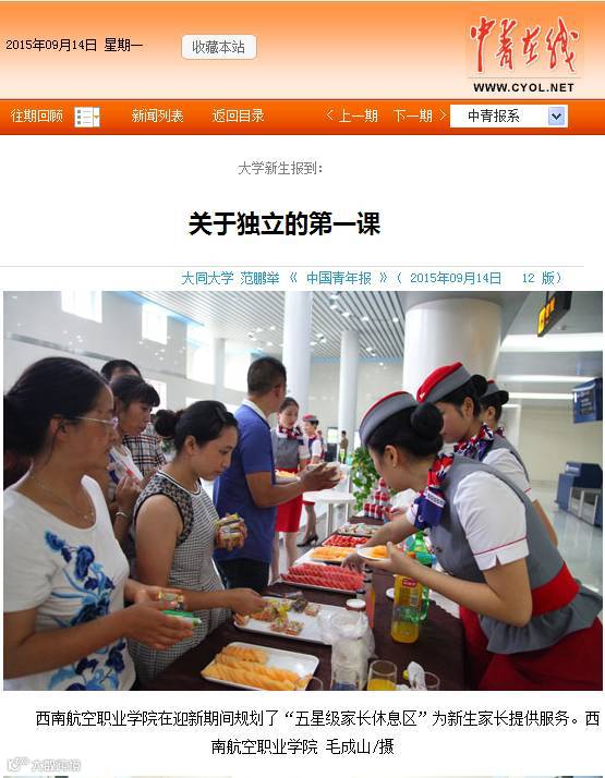 五星级——7月29日西南航空职业学院在迎新期间规划了“五星级家长休息区”。除了空调开启外,还准备了免费的饮料、水果和糕点,现场甚至有“空姐”专门服务。
