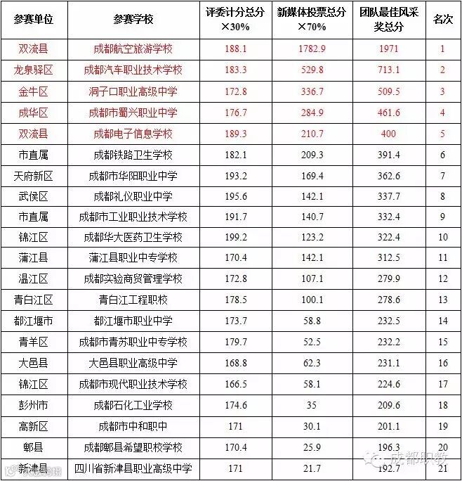 由成都市教育局主办,成都职业教育校企联合会和成都电视台承办的“2015年成都市中职学校学生文明风采竞赛礼仪操大赛”“最佳风采奖”新媒体评选投票结果,于日前正式出炉。据主办方介绍,这次评选各中职学校投票十分踊跃,吸引了近万人次参与投票。最终,“成都航空旅游学校”以总分1971,力压群雄,拔得头筹;“成都汽车职业技术学校”以总分713.1,紧随其后,获得第二名;“成都市洞子口职业高级中学”以总分509.5,取得了第三名的好成绩,成都市蜀兴职业中学和成都电子信息学校分别以总分461.6、400分获四、五名。