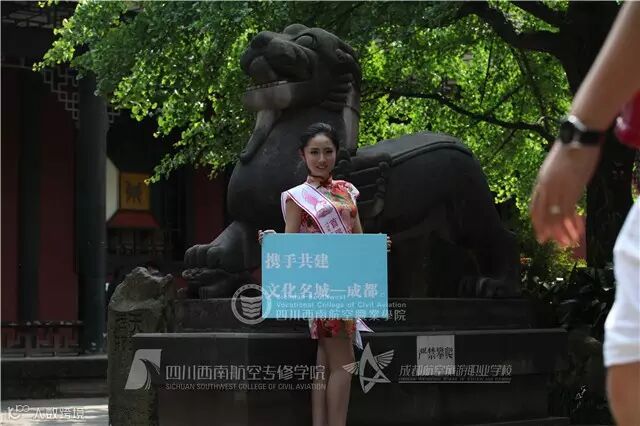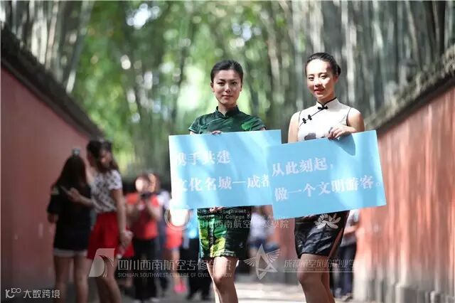十位佳丽身着旗袍,美丽动人。她们手拿写有“亲~不要乱划我,会痛的!”、“爱护文物,是文明的体现”、“携手共建文化名城-成都!”……的宣传牌向大家宣言做文明游客、爱护文物古迹的理念,她们的行为受到游客,以及景区工作人员的啧啧称赞。