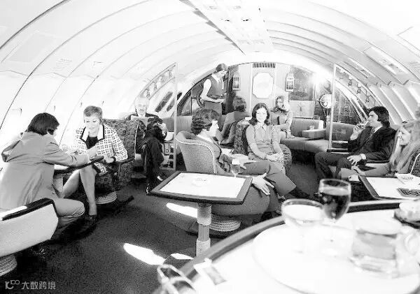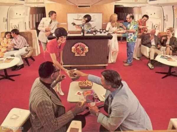 和我们今天见到的方式相似,法航、大陆航空(已并入美联航)和美联航为乘客们提供空间宽敞的座椅和鸡尾酒吧台服务;在法航的头等舱内,乘客们三三两两站在吧台前,或者坐在周围的座椅上享受点心。