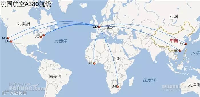法国航空拥有10架A380,以巴黎戴高乐机场为基地,飞往旧金山、洛杉矶、约翰内斯堡、上海及香港等城市。