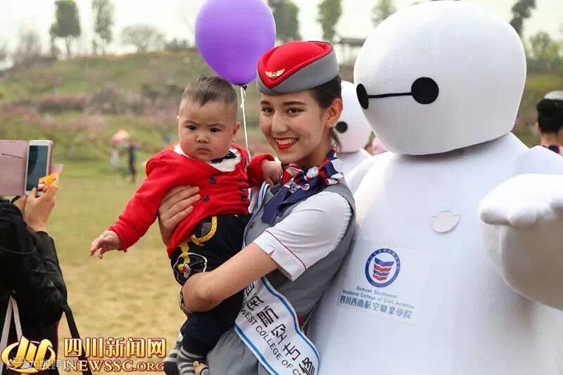 除了扮演大白,还有十余位准空哥空姐自愿充当桃花节志愿者,为游客服务。“现场人比较多,我们要做好引导工作,并尽可能的帮助游客解决问题。”四川西南航空学院本次志愿活动领队陈威宇对所有志愿者学生说。他告诉记者,桃花节开幕,来游玩的人肯定很多,他们想通过做一些有意义的事情来锻炼自己,在得到秀丽东方公园管理方的同意以后,他们周末来做桃花节志愿者,为游客服务。