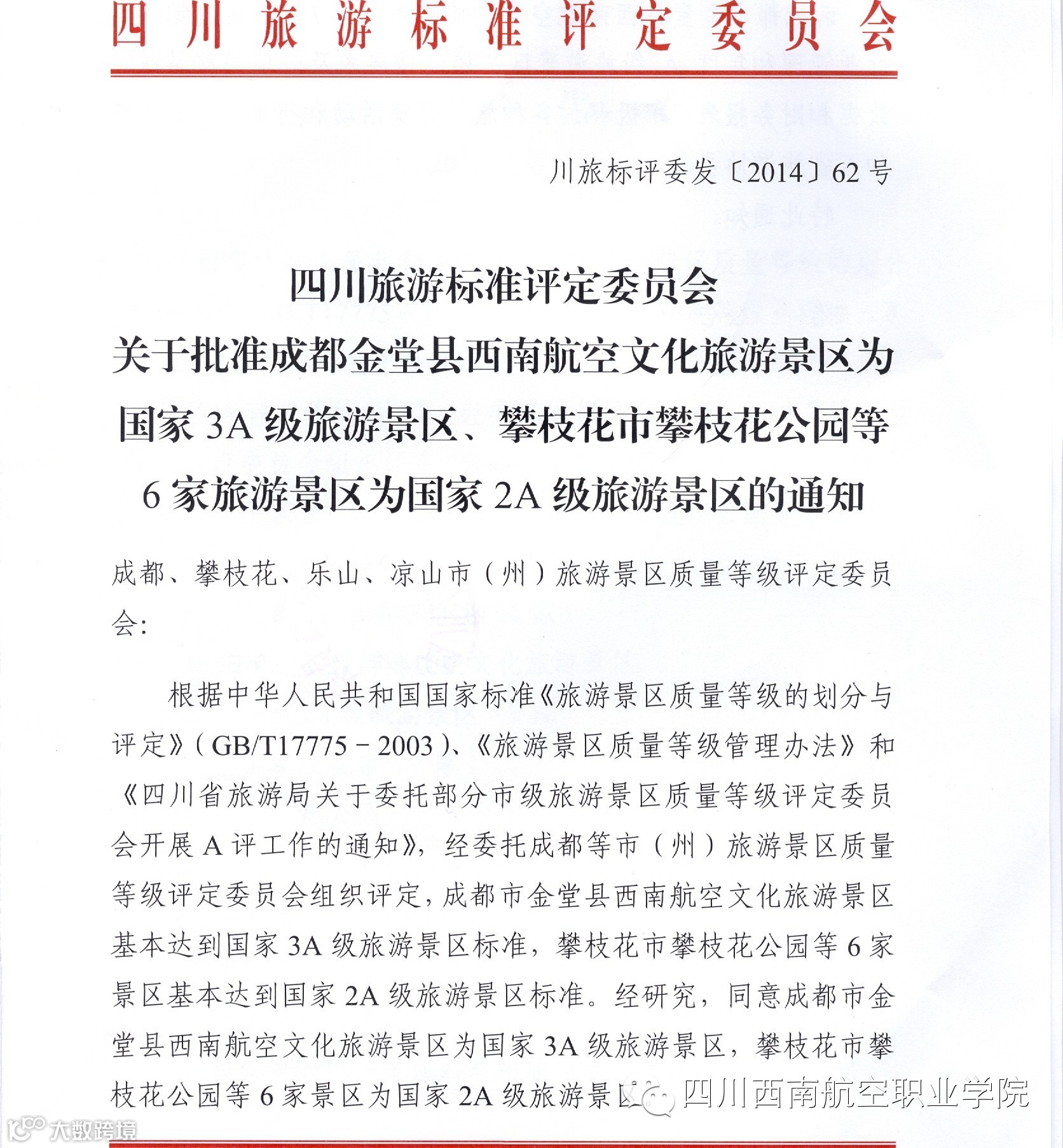 根据中华人民共和国国家标准《旅游景区质量等级的划分与评定》、《旅游景区质量等级管理办法》和《四川省旅游局关于委托部分市级旅游景区质量等级评定委员会开展A评工作的通知》,经委托成都等市(州)旅游景区质量等级评定委员会组织评定,成都市金堂县西南航空文化旅游景区被评为国家3A级旅游景区。