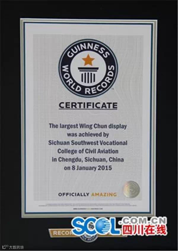 John Garland介绍,西航上万名学生同打咏春拳是迄今史上规模最大的咏春拳表演,超过了之前广东佛山3000余人齐打咏春拳创下的吉尼斯世界纪录,随后,在成都金堂公证处公证下,吉尼斯世界纪录大中华区认证官John Garland宣布:“四川西南航空职业学院史上最大规模咏春拳表演挑战成功,正式入选吉尼斯世界纪录!”并颁发了证书。