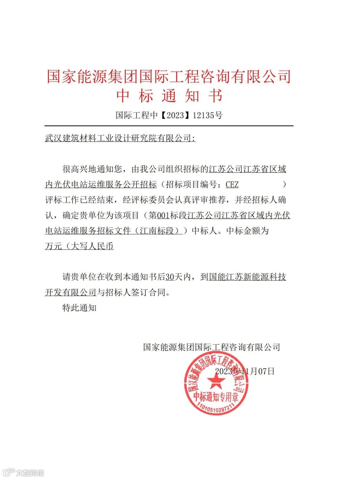 近日,武汉建材院成功中标国能江苏新能源科技开发有限公司(以下简称“国能江苏新能源公司”)江苏省区域内光伏电站(江南标段)运维服务项目。该项目包括苏南(东)、苏南(西)区域光伏运维,预计到2023年底,总装机容量约410.39MWp,到2024年底,总装机容量约547.18MWp。