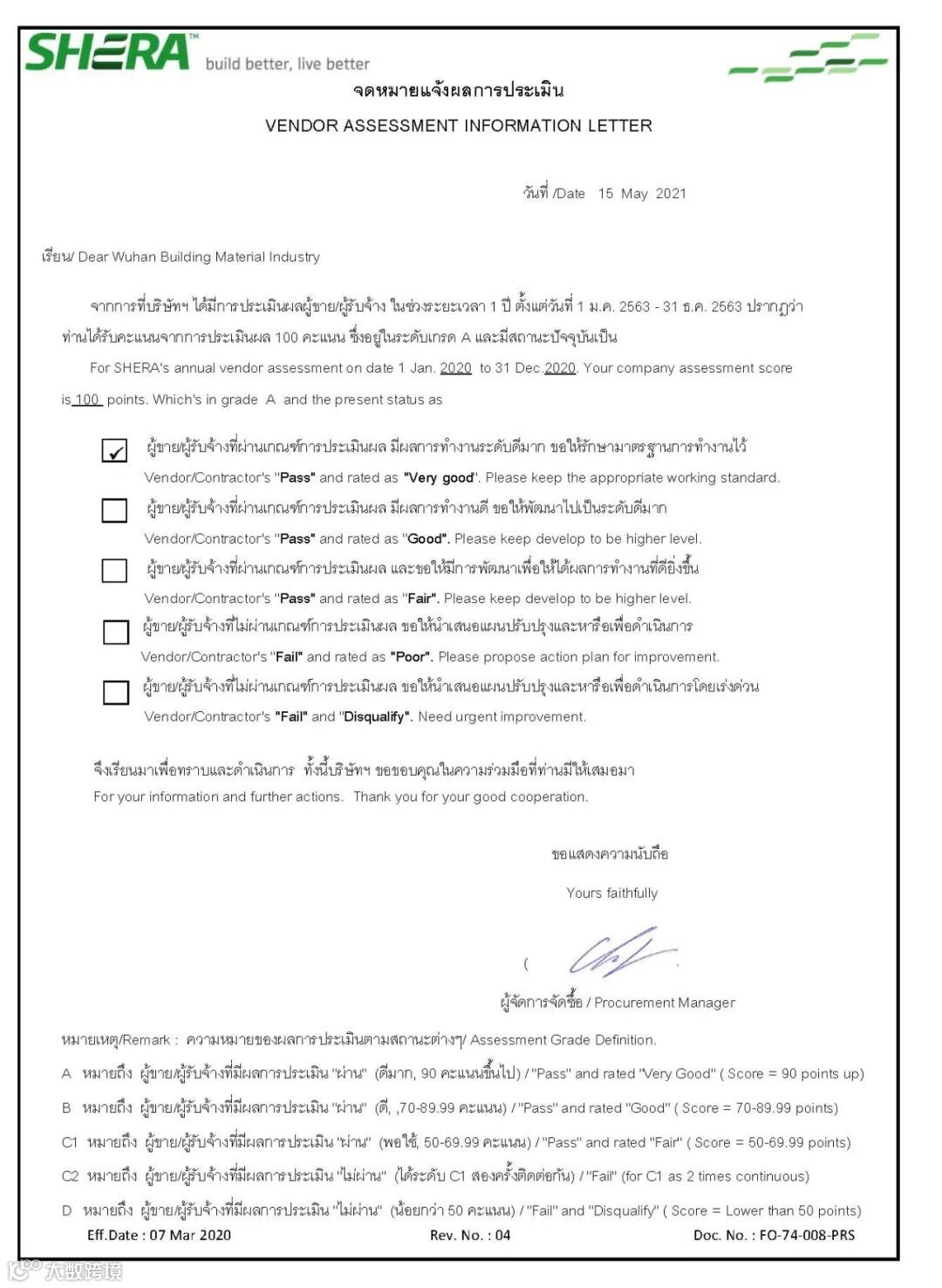 中材节能股份有限公司(以下简称“中材节能”)所属武汉建筑材料工业设计研究院有限公司(以下简称“武汉建材院”)荣获泰国玛哈攀(Shera)集团2020年度供应商年度(2020年1月至12月)A级满分(100分)供应商,得到了玛哈攀最高等级的评定。