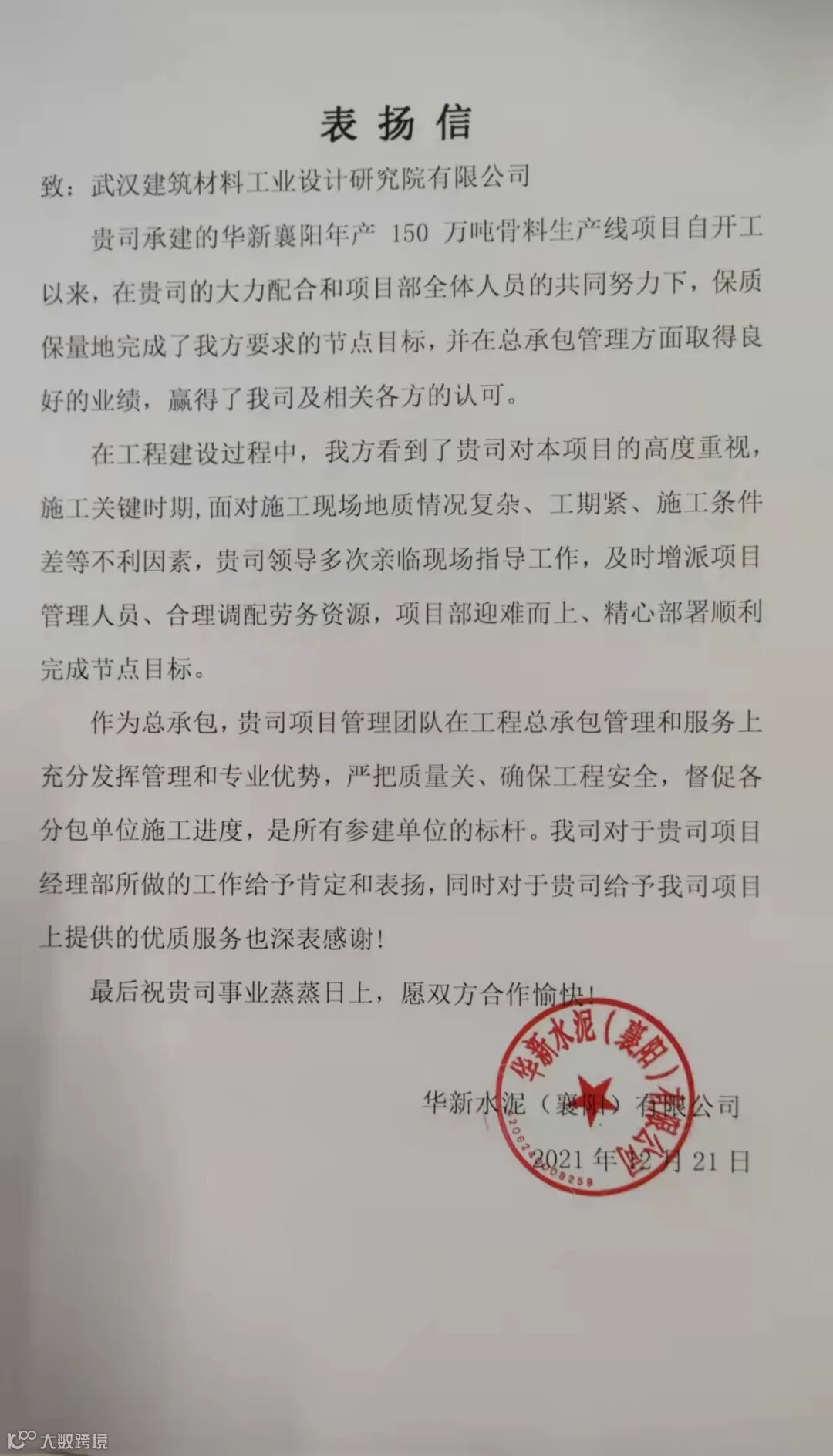 【华新水泥(襄阳)表扬信】
