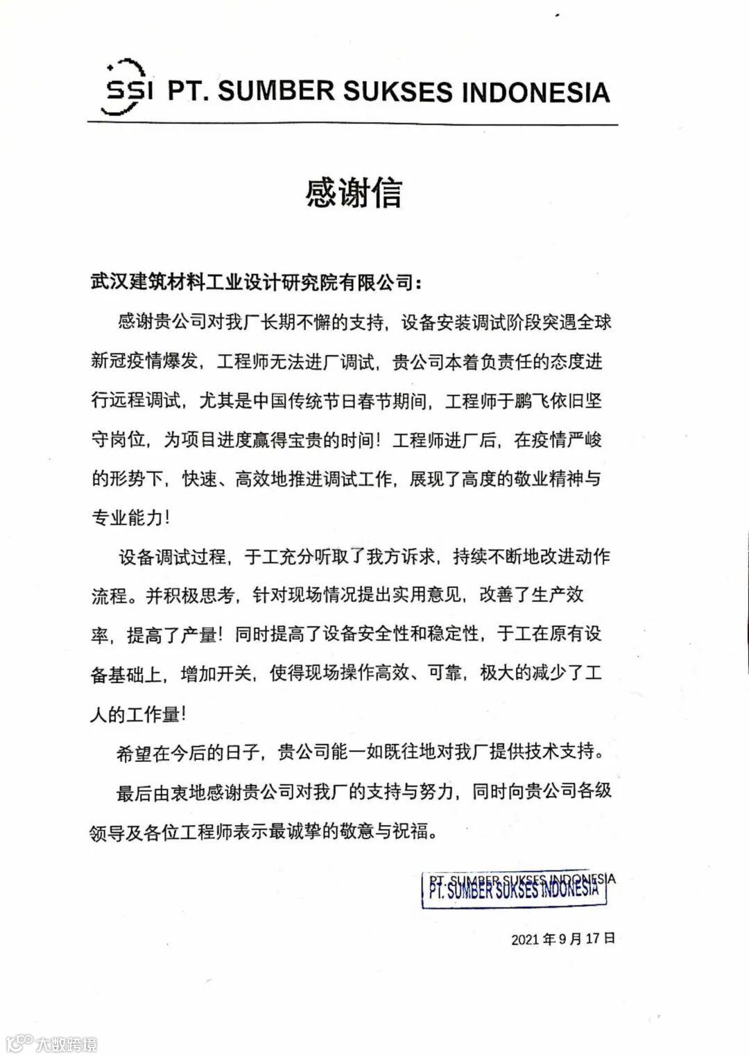 【 印尼三明项目(加气砌块生产线项目)感谢信】