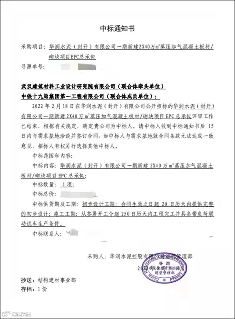 导读:武汉建材院成功中标华润水泥(封开)有限公司加气混凝土板EPC总承包项目
