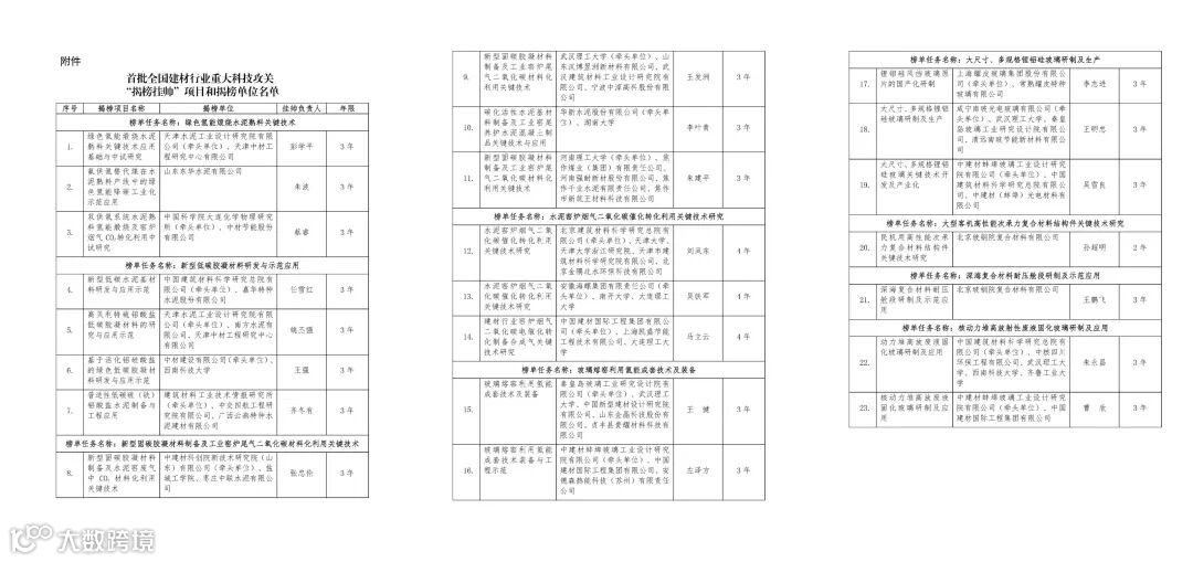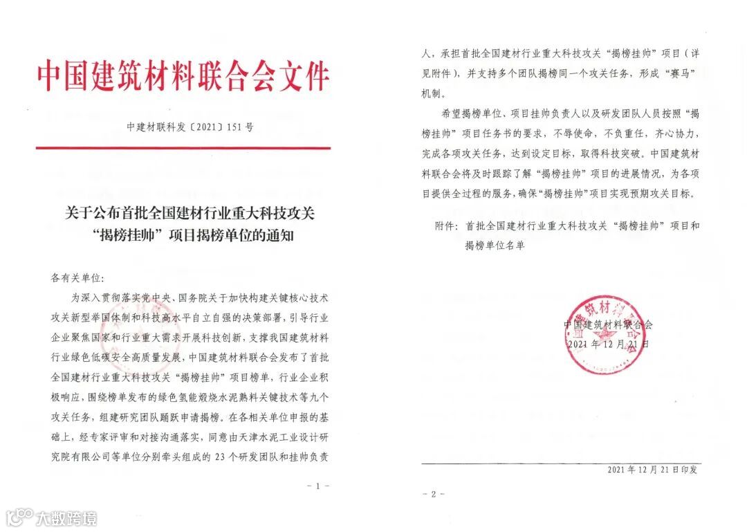 据悉,为贯彻落实党中央、国务院决策部署,引导行业企业聚焦国家和行业重大需求开展科技创新,支撑我国建筑材料行业绿色低碳安全高质量发展,中国建筑材料联合会创新开展了全国建材行业“揭榜挂帅”科技项目攻关工作,发布了首批“揭榜挂帅”项目榜单。