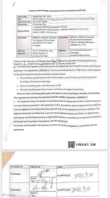 2021年9月10日,由法国圣戈班集团(Saint-Gobain)越南分公司(以下简称圣戈班公司)与武汉建筑材料工业设计研究院有限公司(以下简称武汉院公司)再次合作,共同打造的越南VICO项目纤维水泥板/硅酸钙板项目考核通过,业主签署验收证书。