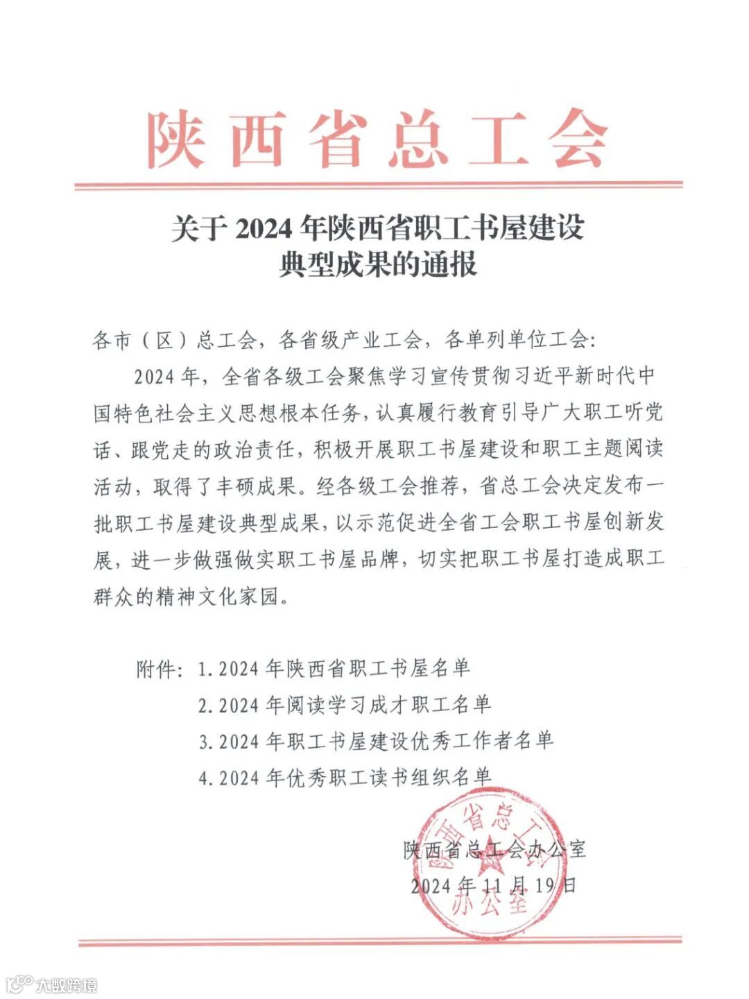 近日,陕西省总工会对2024年陕西省职工书屋建设典型成果进行通报,我院成功获批。