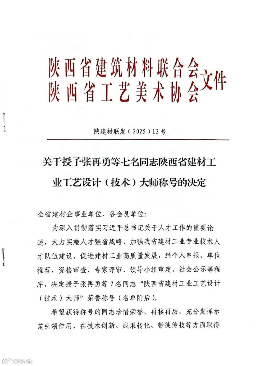 近日,陕西省建材联合会授予我院张再勇同志“陕西省建材工业(材料工程)工艺设计大师” 荣誉称号!