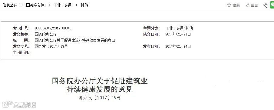 2017年2月21日,《国务院办公厅关于促进建筑业持续健康发展的意见》(国办发 [2017] 19号)在完善工程建设组织模式中提出了培育全过程工程咨询,这也是在建筑工程的全产业链中首次明确了“全过程工程咨询”这一理念,政府投资工程将带头推行全过程工程咨询。