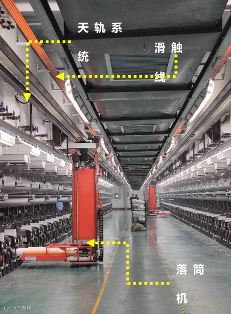 采用天轨机器人第七轴的形式移动,节省空间,地面无任何破坏,方便卷丝机的检修与维护。取丝上筒专用机器人采用无线通讯技术,通过上位流程控制管理系统将卷丝机、专用机器人、理筒机等设备有效连接,人机协同作业。