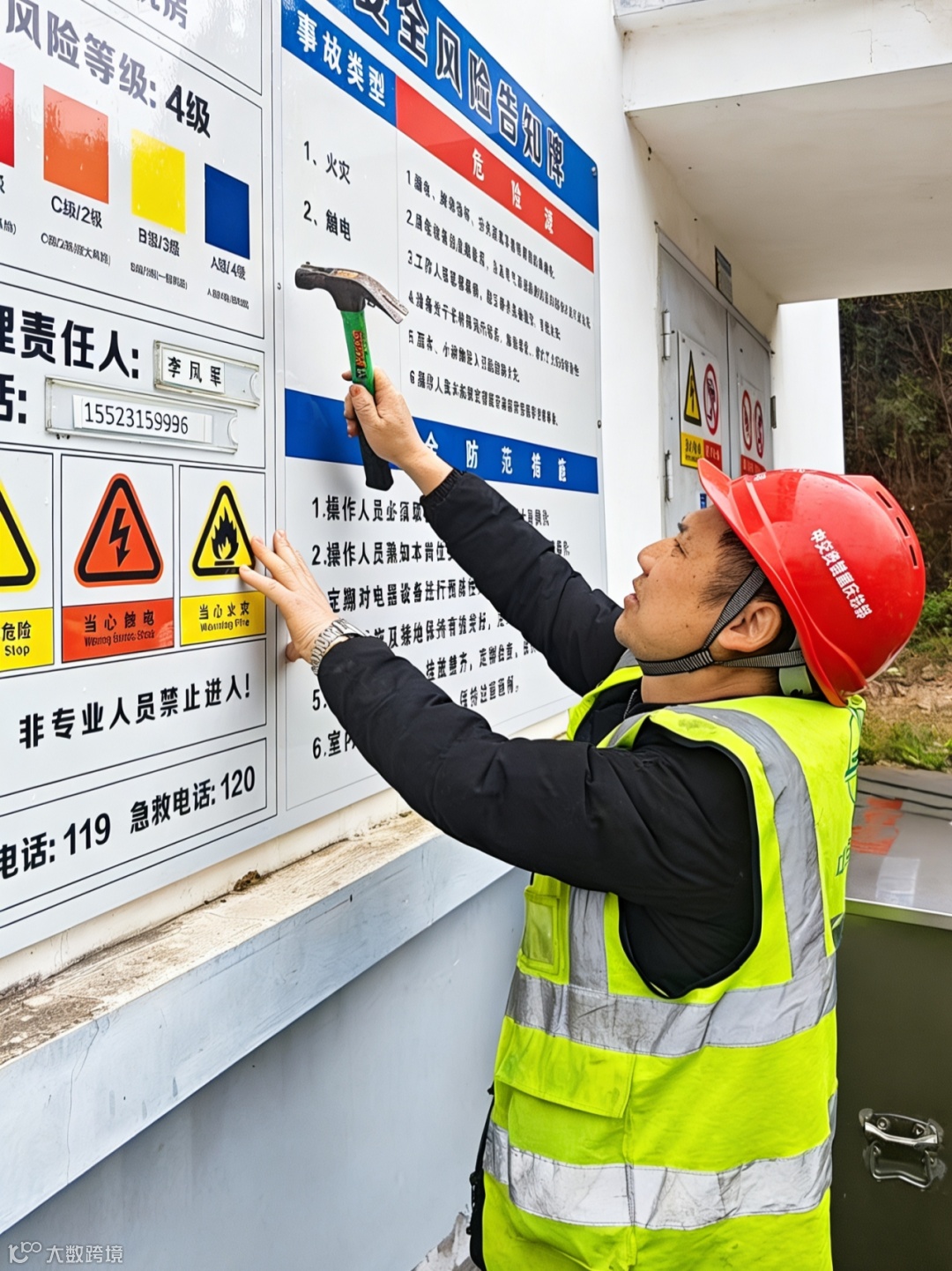 忠万高速机电维护员加固服务区发电机房风险告知牌,夯实安全基石。