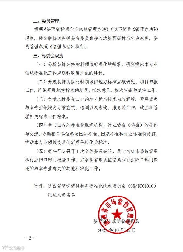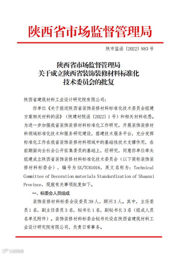 陕西省市场监督管理局关于成立陕西省装饰装修材料标准化技术委员会的批复