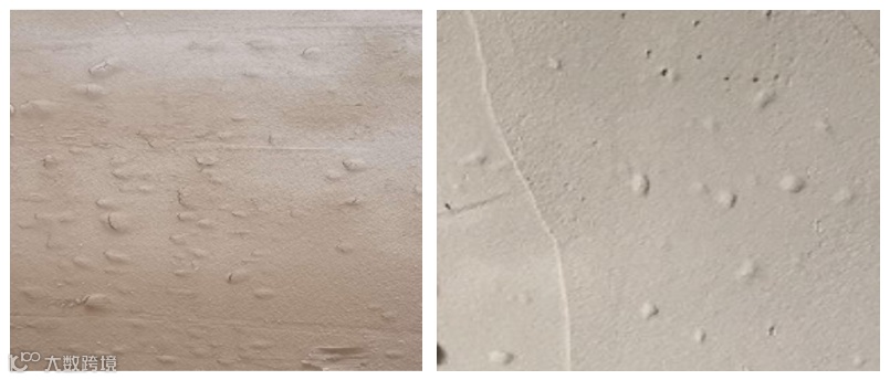(1)基底过于干燥,批刮速度过快,轻质抹灰砂浆的水分被基层吸收后,基层内含的空气没有被及时的机械抹压赶出,在砂浆层形成密集、细小气泡,干燥后铲除或打磨掉气泡即呈现针孔状。