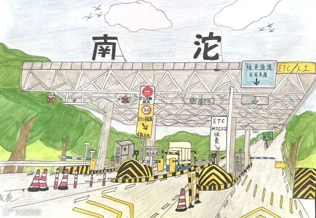 作品介绍:这幅手绘作品以质朴笔触还原了南沱收费站的真实风貌,标识清晰可见,搭配指示牌,精准呈现了高速收费站的功能分区与安全规范。青山绿树环绕其间,既展现了交通设施的秩序感,让静态画面流淌出生活的温度与归属感。