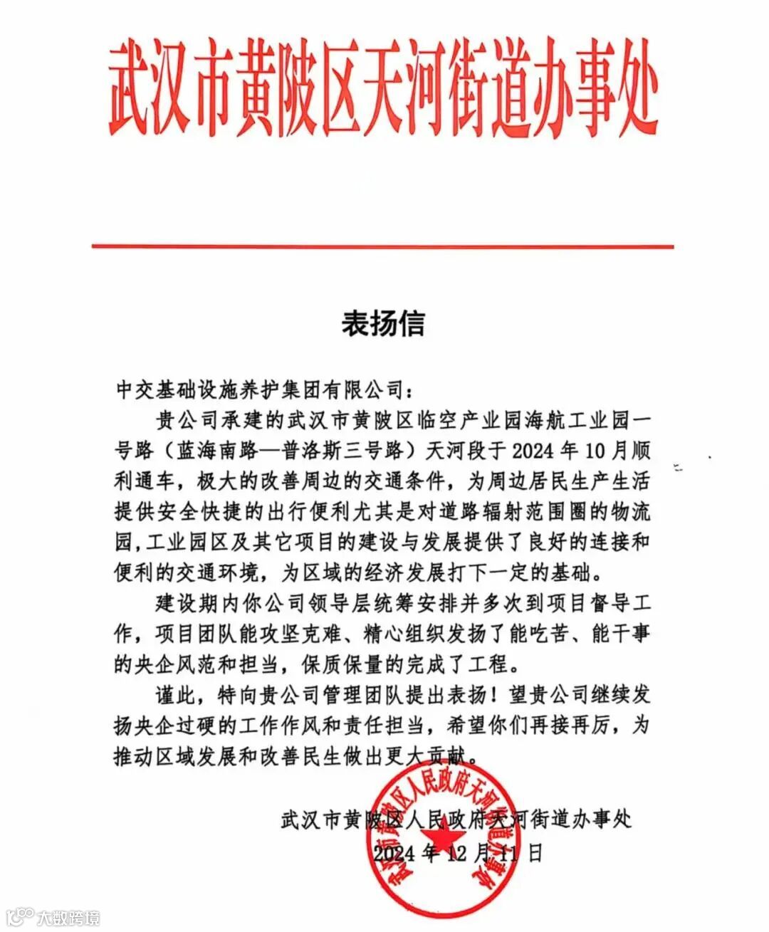 此次表彰,是武汉市黄陂区人民政府天河街道办事处对公司及黄陂项目工作的肯定,项目部将做好后续的收尾工作,以实干诠释担当,为项目顺利交付奠定坚实基础,向业主交出一份满意的答卷。