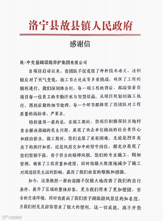 信中提到,在洛宁县故县镇的西子湖旅游项目施工以来,我司项目部不仅克服了各种不利的施工环境,用精细的管理确最大限度的减少了施工对周边居民生活的影响,通过对西子湖旅游公路的施工建设,极大的改善了当地村民的出行条件,提升了区域的整体形象和知名度,还在施工期间积极帮扶当地村委会解决基础的民生设施问题,展现了央企单位极高的社会责任心和政治担当。