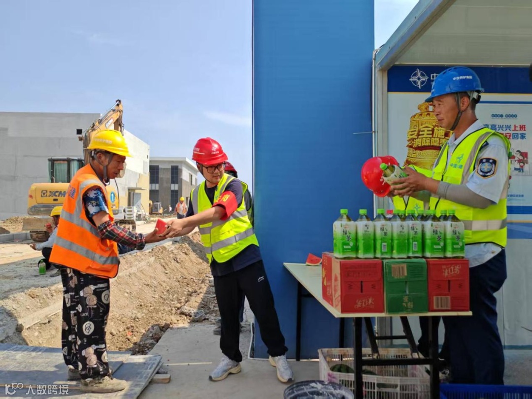 活动现场,管理人员亲手将物资递到工人手中,并叮嘱大家注意防暑降温,合理安排作业时间。