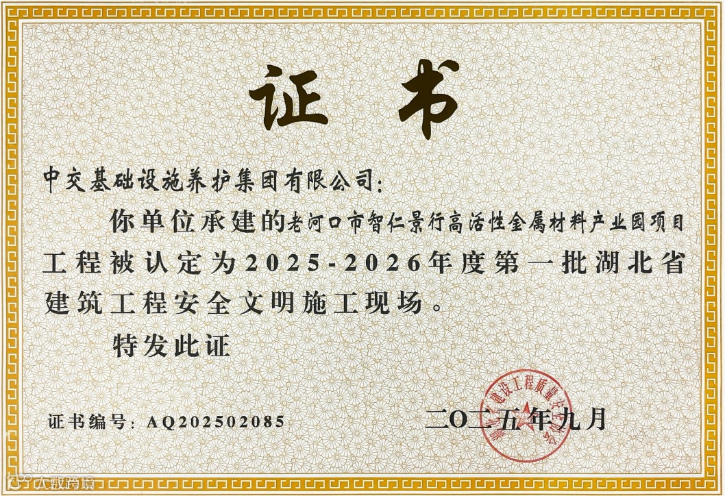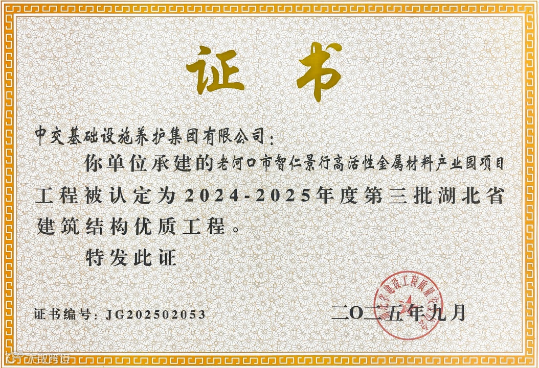 近日,由公司承建的老河口市智仁景行高活性金属材料产业园项目获评“2024-2025年度第三批湖北省建筑结构优质工程”及“2025-2026年度第一批湖北省建筑工程安全文明施工现场”。