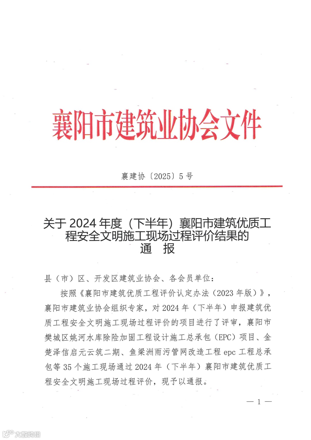 老河口智仁景行项目是老河口市2024年下半年所有在建工程唯一获得此殊荣的建设项目,此项表彰是对老河口项目安全文明施工标准化建设成果的充分肯定,下一步,项目部将进一步抓实项目管理,不断强化安全理念和创优意识,求真务实,争创先进,全力打造精品标杆工程。
