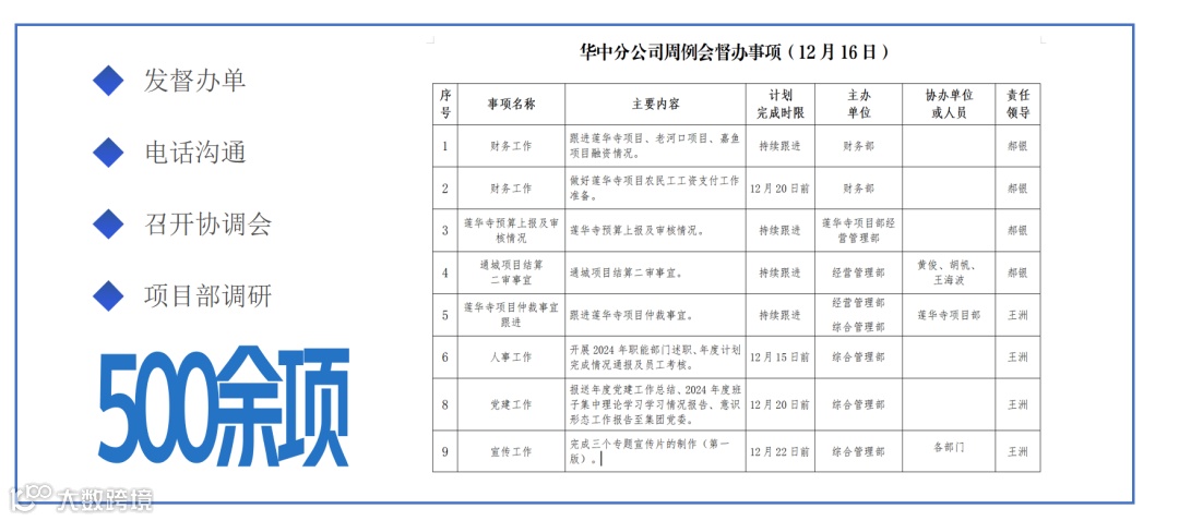统筹做好重大工作计划安排、会议管理、检查督办。细化分解各部门年度工作目标、推动全年重点工作落实,加强会议管理,不断提高会议质量,全年筹备组织召开党支委会、总经理办公会各12次,周工作例会43次,大型专题会议31次。全面落实督办机制,不断提高督查质量,做到了件件有着落、事事有回音,全年督办落实500余项工作,高效率推动决策落实。