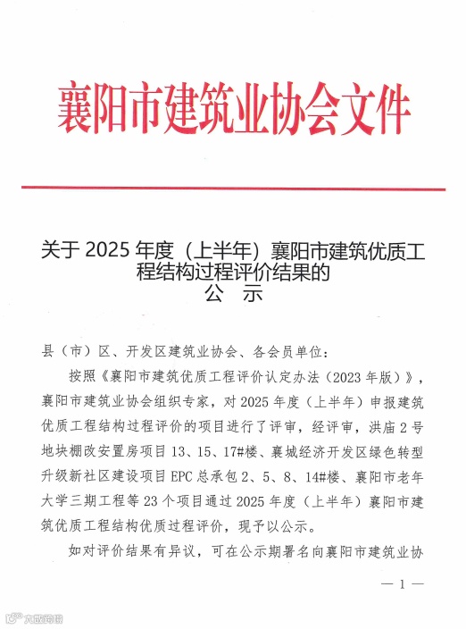 8月6日,智仁景行项目在2025年(上半年)襄阳市建筑优质工程(结构工程)过程评价中,顺利通过评审并获得高度认可,荣获襄阳市建筑优质工程“结构优质工程”荣誉。