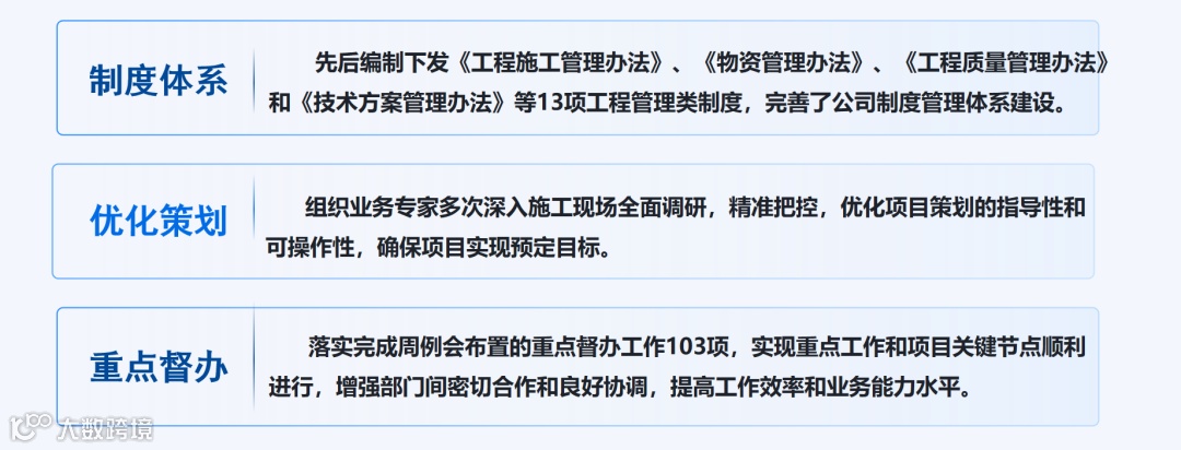 健全体系,重视策划与督办管理。先后编制下发《工程施工管理办法》、《物资管理办法》等13项工程管理类制度,完善了公司制度管理体系;组织业务专家多次深入施工现场全面调研,精准把控,优化项目策划的指导性和可操作性,确保项目实现预定目标。三是落实完成周例会布置的重点督办工作103项,实现重点工作和项目关键节点顺利进行,增强部门间密切合作和良好协调,提高工作效率和业务能力水平。
