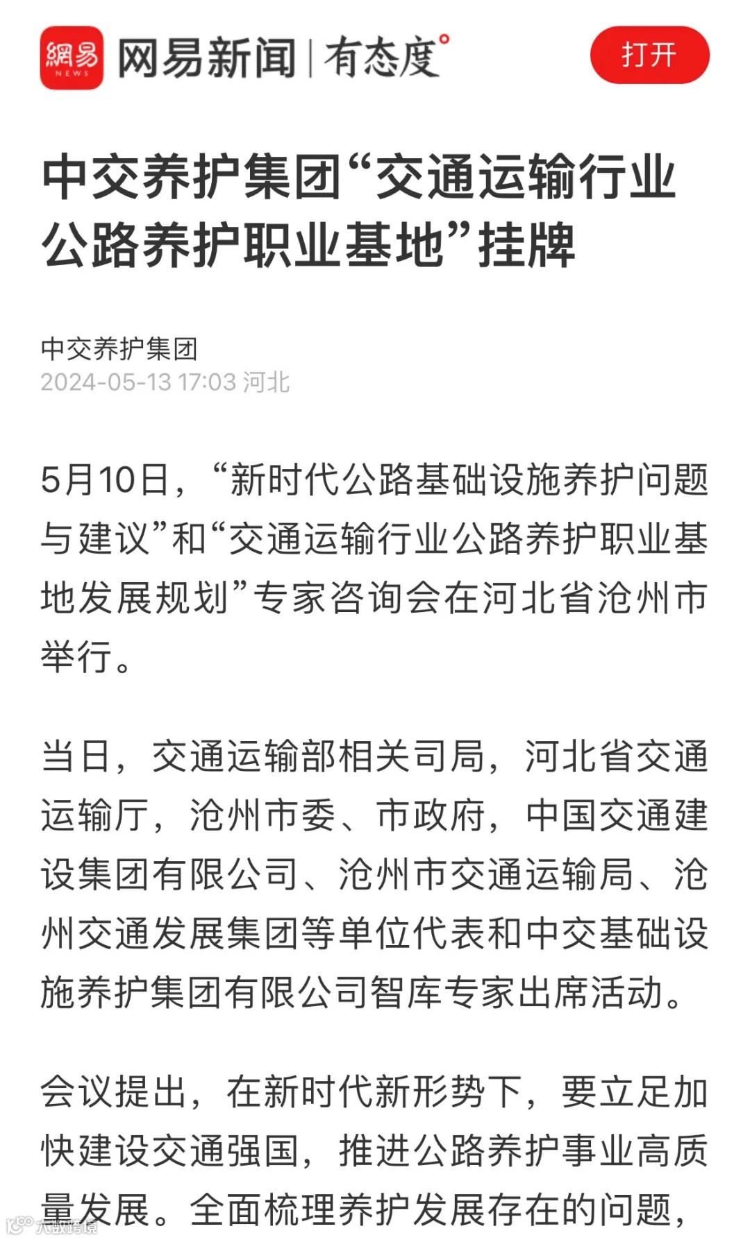 近日,人民网、《工人日报》、中工网、网易新闻、《沧州日报》、沧州新闻、《中国交通报》关注报道中交养护集团“交通运输行业公路养护职业基地”挂牌。为进一步加强交通运输职业研究和技术技能人才队伍建设,切实提高公路养护从业人员技能水平,交通运输部职业资格中心经研究后授予中交养护集团“交通运输行业公路养护职业基地”,旨在服务国家战略和行业发展,深化行业产教融合,开展学科建设、拓宽职业发展通道,培养实用型、技能型人才,助力企业打造公路养护人才梯队。交通运输行业公路养护职业基地是全国首个公路养护型基地,公司锚定国内领先、国际一流的发展方向,将培训基地逐步建设成为在全国公路养护行业具有示范性、引领性,集公路养护病害展示、新技术和新装备研发推广、公路养护人才培养和素质提升三位一体的综合性基地。