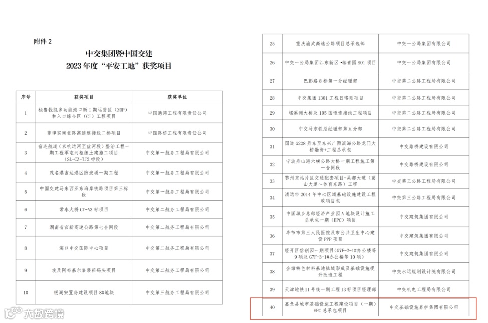 近日,中交集团暨中国交建公布2023年度“平安中交”系列评选结果,由公司承建的嘉鱼县城市基础设施工程建设项目(一期)EPC 总承包项目获评中交集团暨中国交建2023年度“平安工地”。