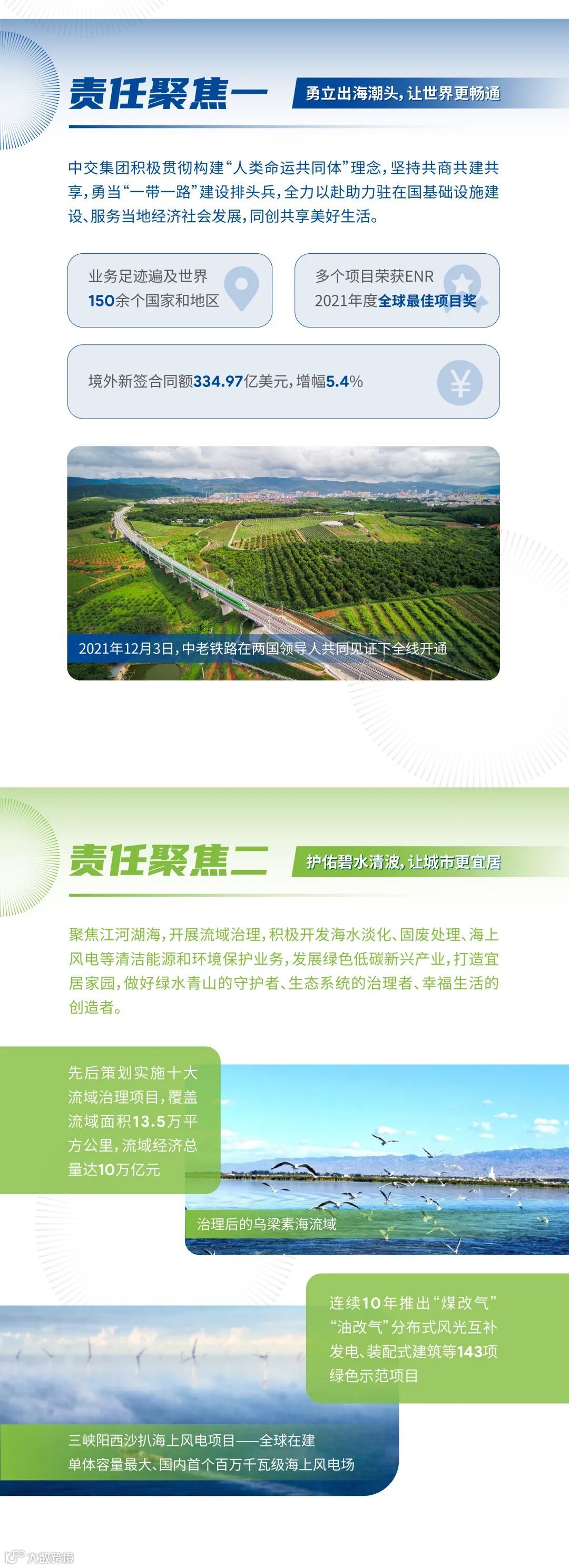 《中交集团2021社会责任报告》主要内容分为“谋新局·筑报国强企之梦”“谱新篇·铸永续长青之梦”“奏新声·助和谐共生之梦”三大部分,系统展现中交集团对国家、环境、客户、伙伴、员工、社会等的履责理念、实践与成效,充分回应了利益相关方的责任期望与诉求。报告还设置了“一带一路”建设、生态环境保护、助力乡村振兴三个专题,充分诠释了中交集团“让世界更畅通、让城市更宜居、让生活更美好”的企业愿景,彰显了中交作为国资央企始终心怀“国之大者”的责任与担当。