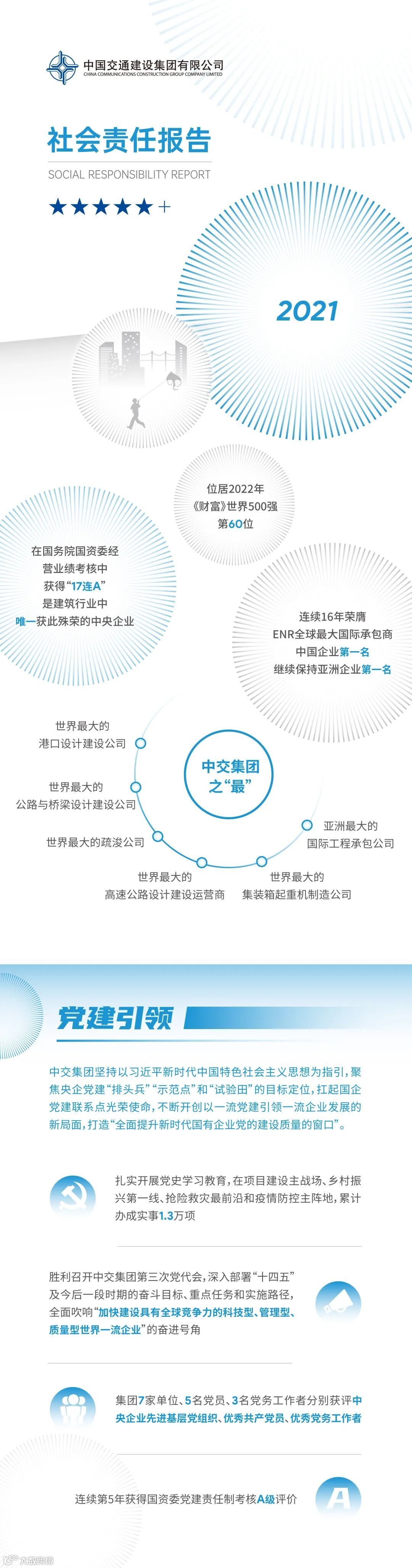 近日,中国企业社会责任报告评级专家委员会发布评级结果,《中交集团2021年社会责任报告》被综合评为“五星佳”级,蝉联最高评级。评级结果显示,《中交集团2021社会责任报告》的过程性、实质性、完整性、平衡性、可比性、可读性及创新性等7个评级维度均表现卓越,综合评为“五星佳”级,是企业社会责任报告的典范,凸显了中交集团在公司治理、责任管理等方面的领先优势。
