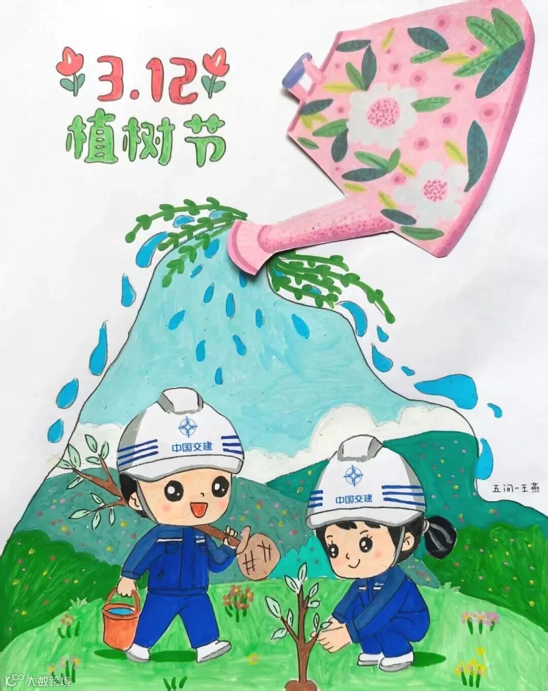 作品介绍:以植树节为创作背景,定格了中交娃娃在春日山野间栽树培土、浇水护苗的忙碌身影,用鲜活的劳动场景传递“植绿护绿、共建生态”的责任担当。