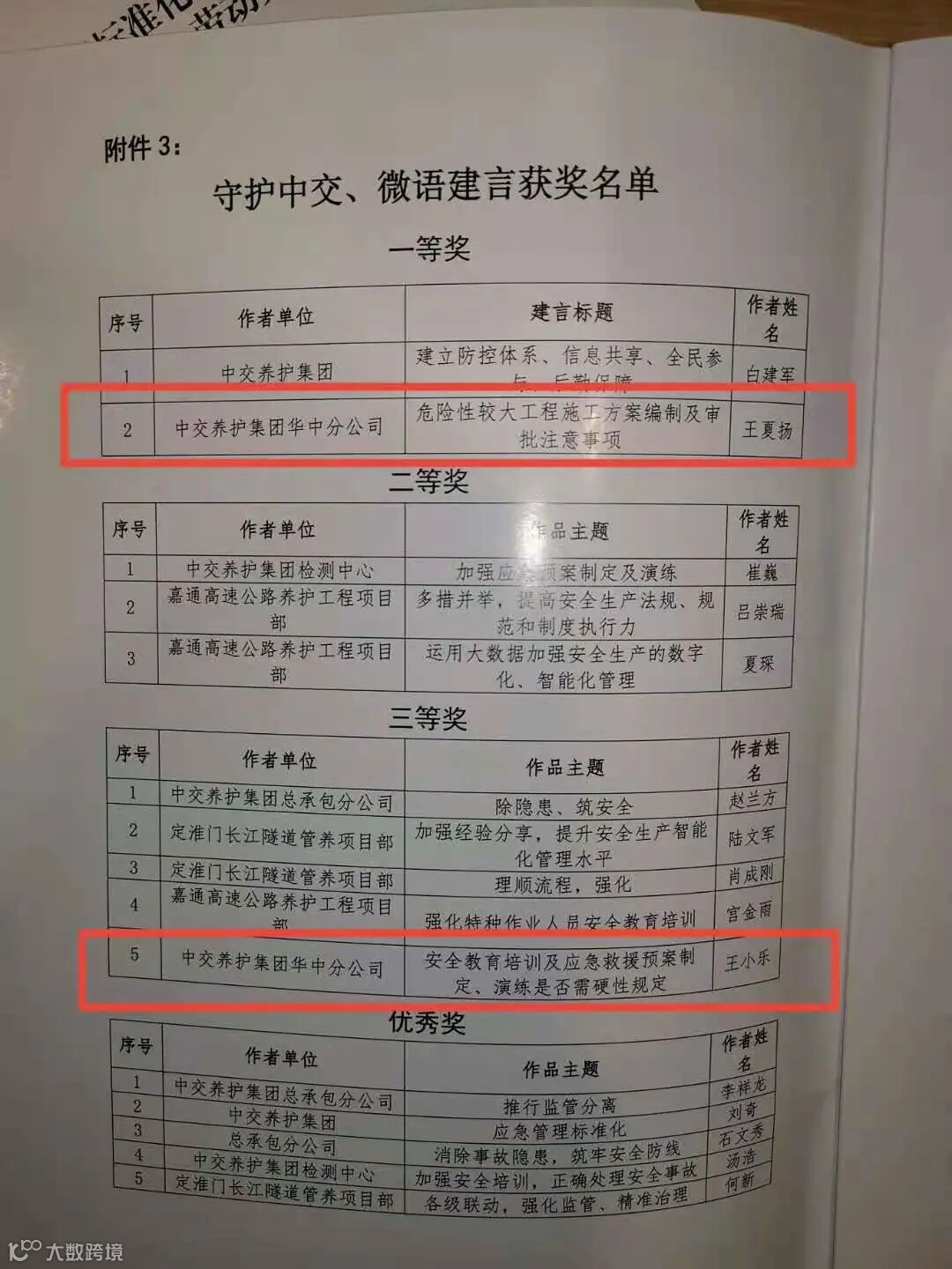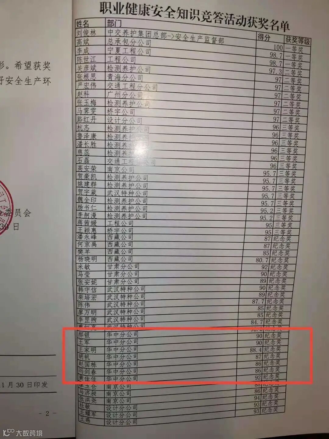 华中分公司在“职业健康安全知识竞答活动”中,冯剑春、赵国栋、郝银、王军、胡帆、王家明、黄佳佳获得纪念奖;在“安全隐患随手拍”活动中,王小乐获得优秀奖;在“守护中交、微语建言”活动中王夏扬获得一等奖,王小乐获得三等奖。活动开展充分调动了职工群众自觉消除事故隐患,筑牢安全防线的责任意识,营造了营造了“人人讲安全、人人要安全、人人保安全”的良好氛围。