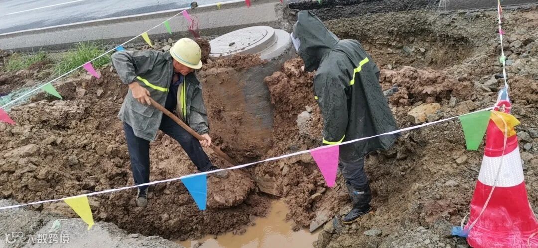 在项目领导的带领下,首先对全线进行安全排查,并对排水不通,积水过多的地方进行紧急处理。经排查,发现主要问题为以下三个方面:一是部分辅道部位因没有出水口,导致积水,对此采用铁锹疏通,排除积水;二是土铺街部位出现大量积水,已经即将淹没老路路面,施工队采用挖机对该部位的积水进行疏导,引流;三是大王庄桥部位雨水管出水口存在问题,现场立即安排施工队对该部位重新修建。通过大家的努力,排水问题得到了彻底解决,既避免了水浸路基带来的危害,也保证了过往行人车辆的安全。