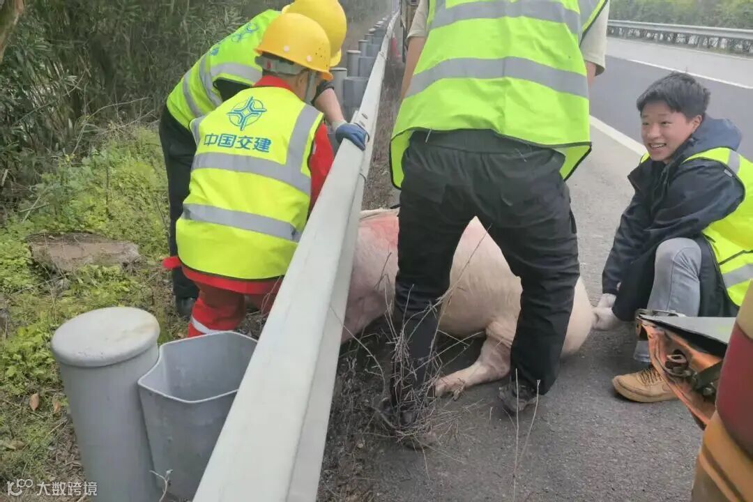 发现险情后,渝西管理中心立即启动应急处置流程:值班人员、养护人员、巡查员火速赶赴现场,靠边停车、开启警示灯、摆放安全标志、划定警戒区域,引导车辆减速避让。由于生猪重约300斤,难以直接控制,大家分工协作、耐心引导,将其转移至应急车道,并护送至管理中心妥善安置。