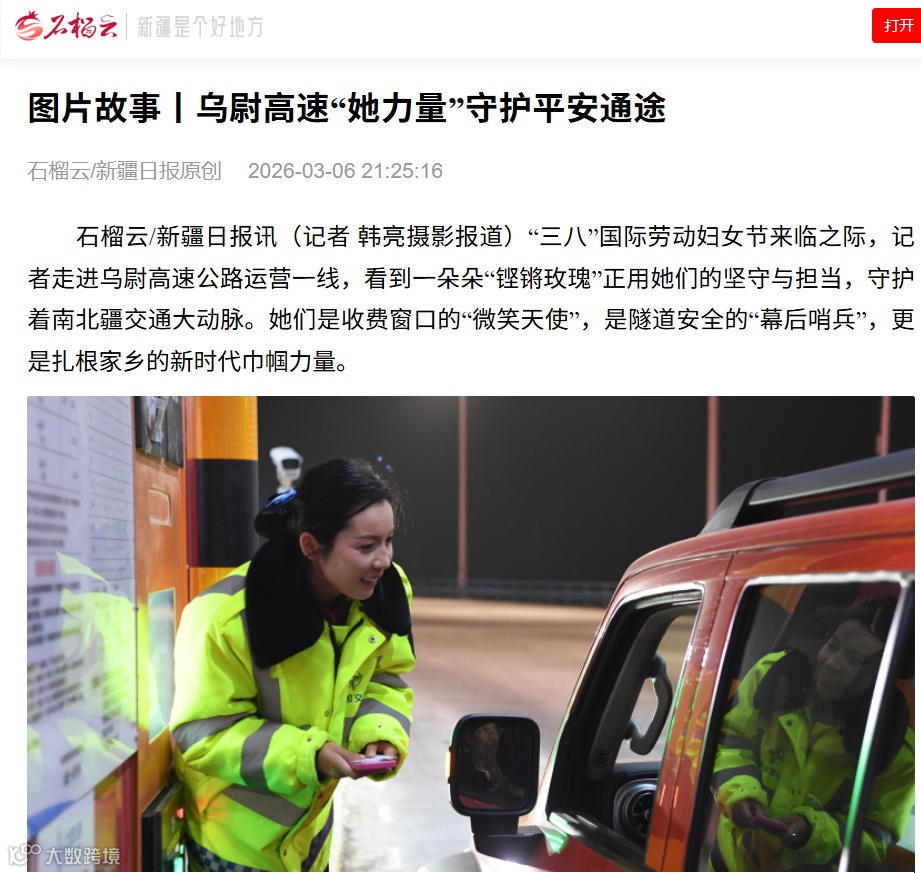 石榴云/新疆日报讯(记者 韩亮摄影报道)“三八”国际劳动妇女节来临之际,记者走进乌尉高速公路运营一线,看到一朵朵“铿锵玫瑰”正用她们的坚守与担当,守护着南北疆交通大动脉。她们是收费窗口的“微笑天使”,是隧道安全的“幕后哨兵”,更是扎根家乡的新时代巾帼力量。