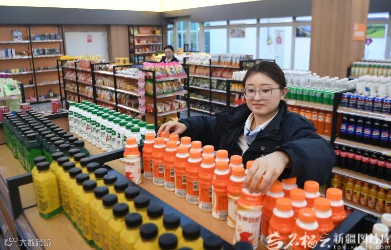 3月5日,乌尉高速永丰服务区工作人员帕日代姆·托尔阿西在整理超市货物。